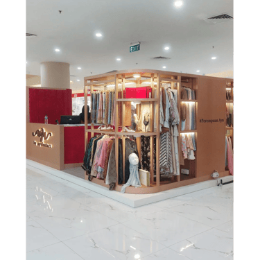 Pemasangan rak display, panel dinding, sistem penggantungan produk, serta panel cermin dilakukan secara terkoordinasi untuk memastikan setiap elemen terintegrasi dengan baik dan mendukung tampilan visual ruang secara keseluruhan.