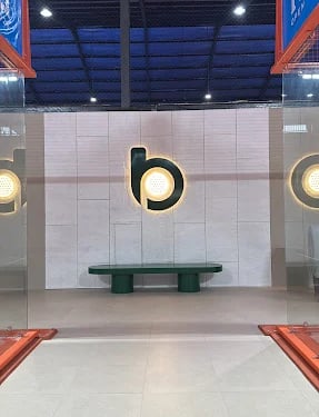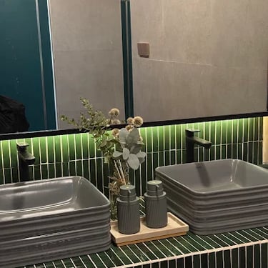 Pemasangan material keramik dengan bentuk melengkung dilakukan dengan perhatian khusus terhadap presisi potongan dan penyusunan material agar menghasilkan bentuk yang rapi dan dinamis sesuai dengan gambar kerja. Integrasi sistem pencahayaan dilakukan secara terkoordinasi untuk memastikan setiap elemen terpasang dengan rapi dan sesuai dengan posisi yang telah direncanakan.