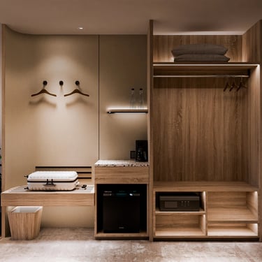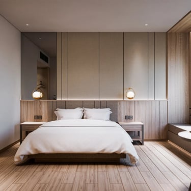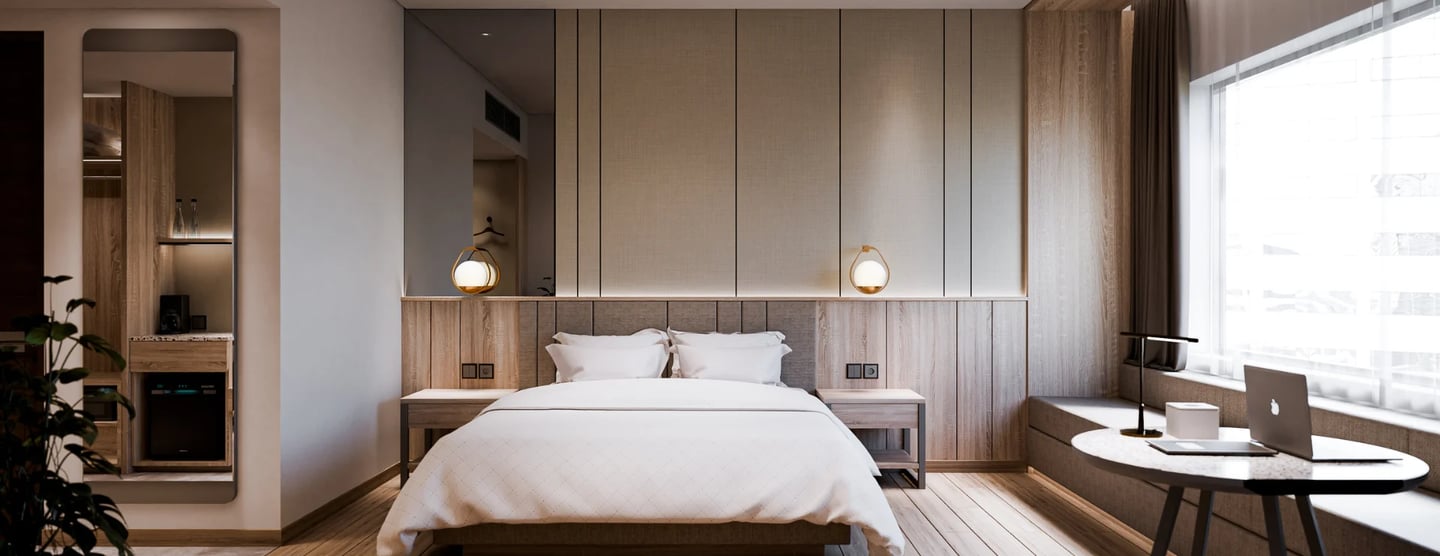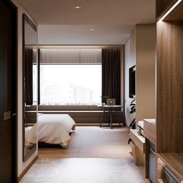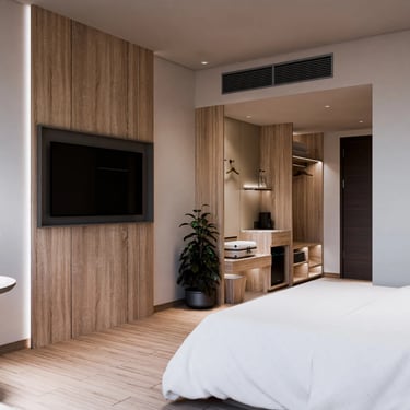 Kamar hotel pada proyek M Hotel dirancang dengan pendekatan modern yang menekankan efisiensi tata ruang serta suasana visual yang tenang bagi kenyamanan tamu. Perancangan visual difokuskan pada pengembangan layout yang optimal serta pemilihan elemen desain yang mendukung fungsi ruang secara maksimal.