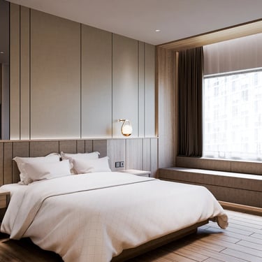 Tempat tidur ditempatkan sebagai elemen utama ruang untuk menciptakan fokus visual yang jelas. Area duduk ditempatkan di dekat jendela untuk memberikan fleksibilitas penggunaan ruang, baik untuk bersantai maupun bekerja dengan memanfaatkan pencahayaan alami secara optimal.
